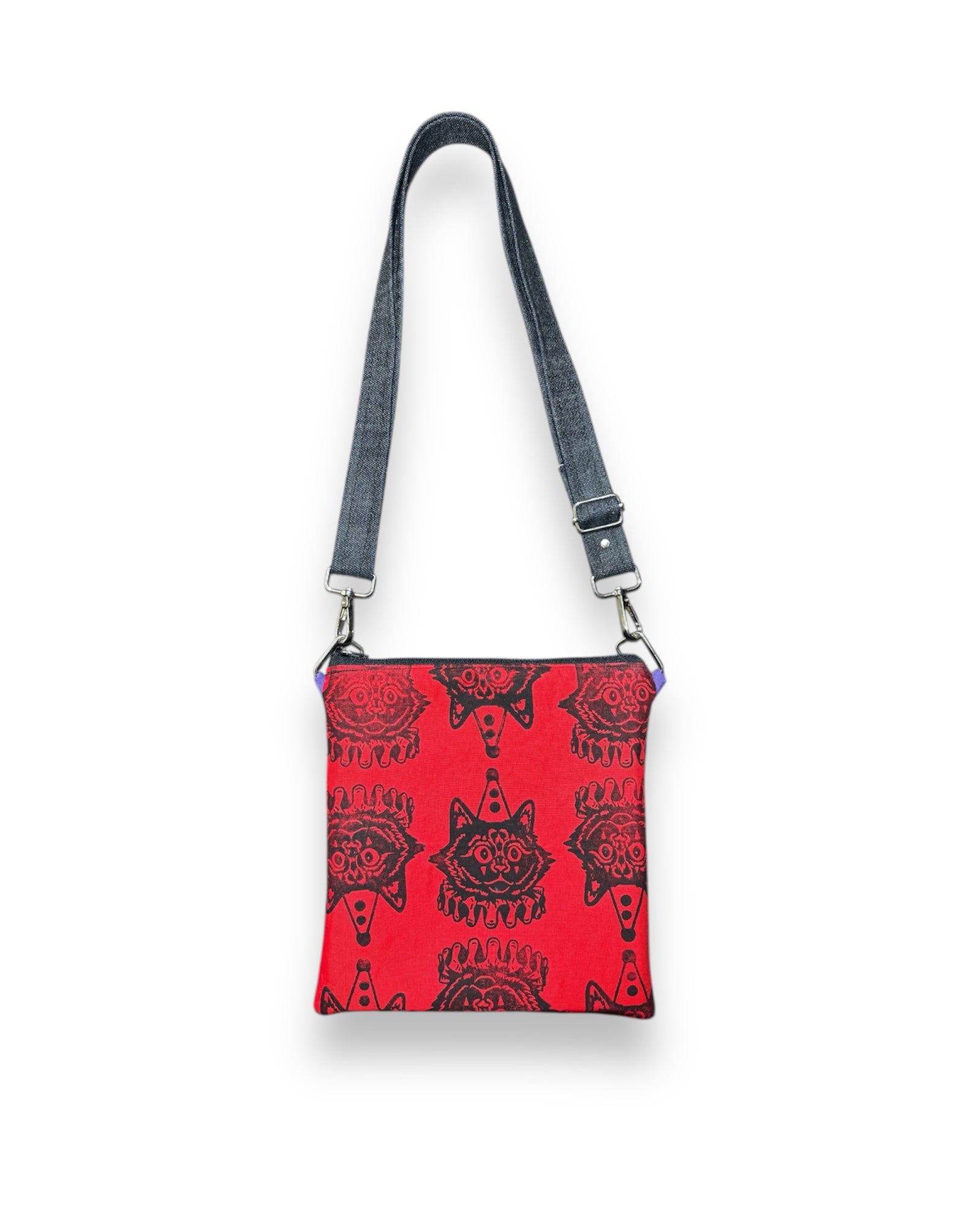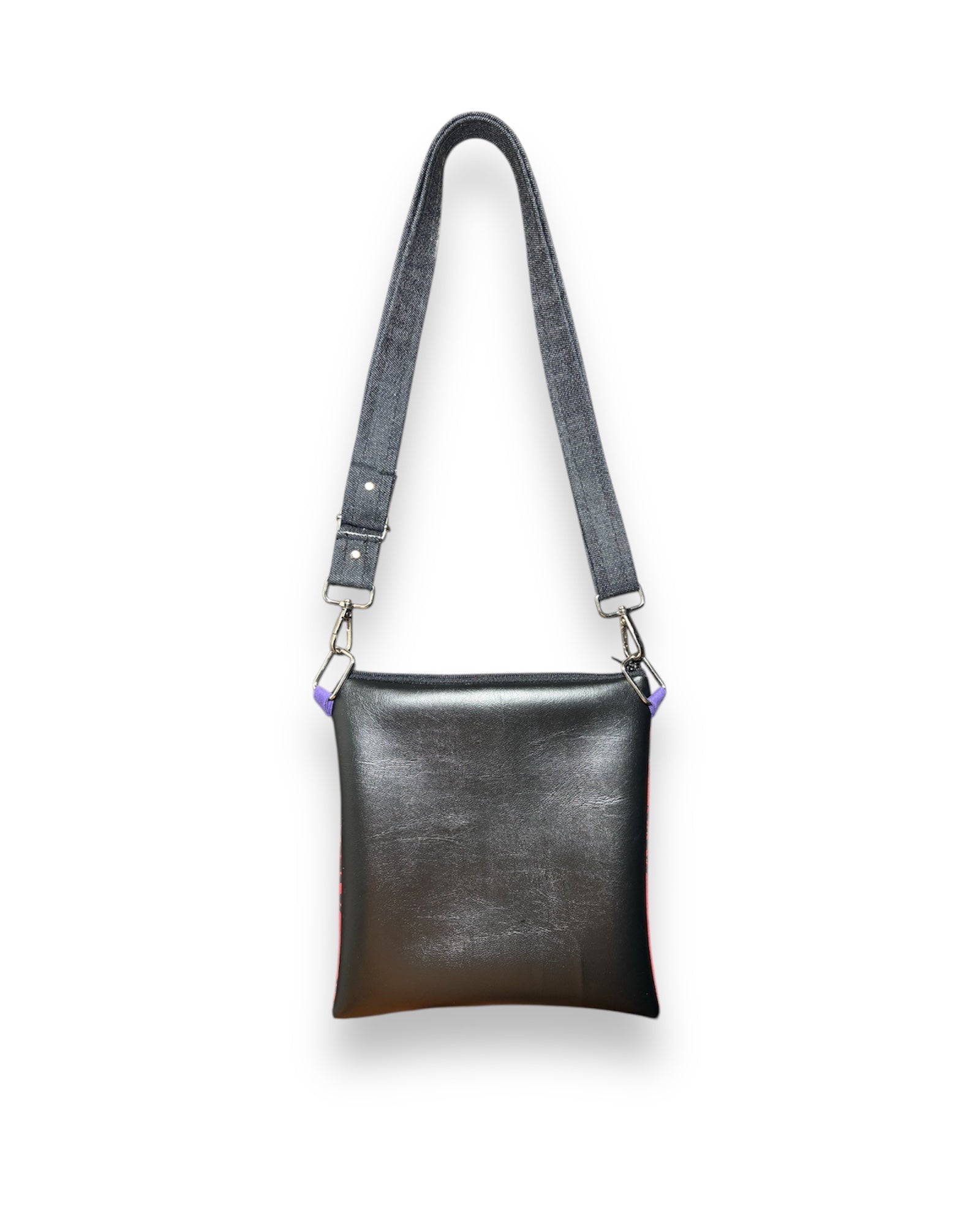 Impreso a mano • 100% algodón • Correa ajustable de mezclilla • Vinilo vegano en la parte posterior • Tejido decorativo en el interior • Cierre de cremallera YKK.