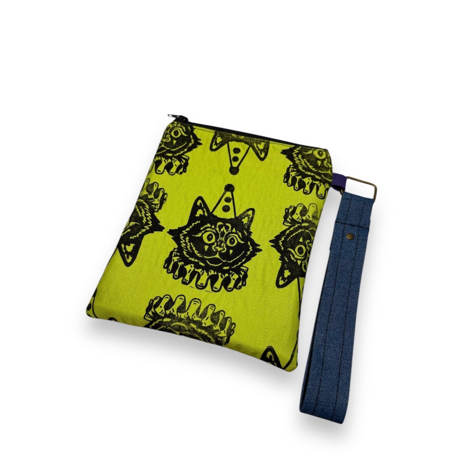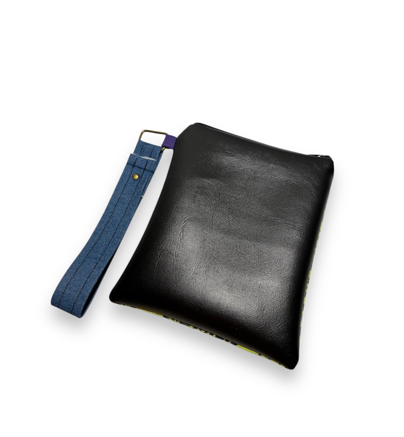 Impreso a mano • 100% algodón • Correa de mano en mezclilla • Vinilo vegano en la parte posterior • Tejido decorativo en el interior • Cierre de cremallera YKK.